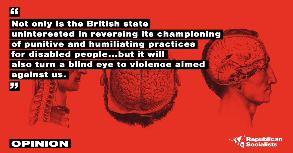 Neither of these incidents happened in a political vacuum. They combine, in the simplest terms, some of the most fundamental contradictions in contemporary neoliberal Britain. Without a strategy which guarantees meaningful life choices for many disabled and neurodivergent people, and with the British state unwilling to intervene as a matter of practice, the limitations of capitalism are reproduced in the violence of the institution. In the wider context of the ableised nature of British austerity, these instances of abuse are unsurprising. It has been made clear for more than a decade that not only is the British state uninterested in reversing its championing of punitive and humiliating practices for disabled people when we try to claim benefits or access support services, but will also turn a blind eye to violence aimed against us. Offloading this responsibility to private companies has allowed Conservative governments to not only wash its hands of individual situations such as this, but also of the last decade of austerity and its specific impacts on disabled people, which continues to be buried and forgotten. If they are unwilling to give £20 a week extra in Employment and Support Allowance (ESA), as members of Disabled People Against Cuts (DPAC) have been fighting for over the last few weeks, even as a token to offset the worst impacts of the pandemic, we know what they think of these incidents. An ‘unfortunate but inevitable’ tragedy. Nothing to see here.